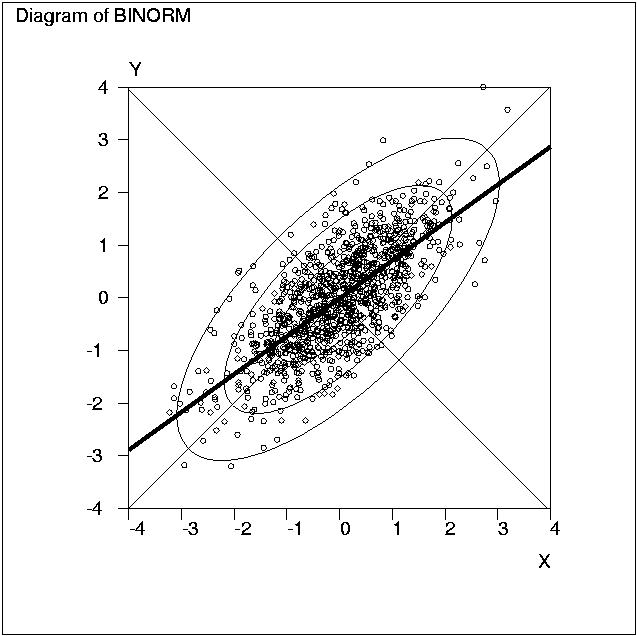 1 * 2 *FILE CREATE BINORM,8,23 *1000 havainnon otos kaksiulotteisesta normaalijakaumasta 4 *jossa E(X)=E(Y)=0 S(X)=S(Y)=1 R(X,Y)=0.7 5 *FIELDS: 6 *1 N 4 X 7 *2 N 4 Y 8 *END 9 * 10 *FILE INIT BINORM,100011 * 12 *VAR X,Y TO BINORM13 *R=0.7 14 *U=probit(rnd(1)) V=probit(rnd(1)) 15 *X=U Y=R*U+sqrt(1-R*R)*V 16 * 17 *CORR BINORM,CUR+118 *Means, std.devs and correlations of BINORM N=1000 19 *Variable Mean Std.dev. 20 *X -0.023622 1.008356 21 *Y -0.023204 1.010290 22 *Correlations: 23 * X Y 24 * X 1.0000 0.7177 25 * Y 0.7177 1.0000 26 *....................................................................... 27 *PLOT BINORM,X,Y28 *SCALE=-4(1)4 29 *CONTOUR=[line_width(0.5)],0,0.5,0.9,0.99 30 *TREND=[line_width(2)],0 31 *SIZE=1164,1164 DEVICE=PS 32 *....................................................................... 33 *